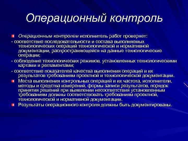 2.Операционный. Представляет собой технический контроль, проводимый в процессе выполнения конкретных работ. В его процессе производят оценку правильности применения технологий, контролируют соблюдение строительных норм и стандартов на каждом этапе. Операционный контроль имеет периодический характер. Его результаты документируются.