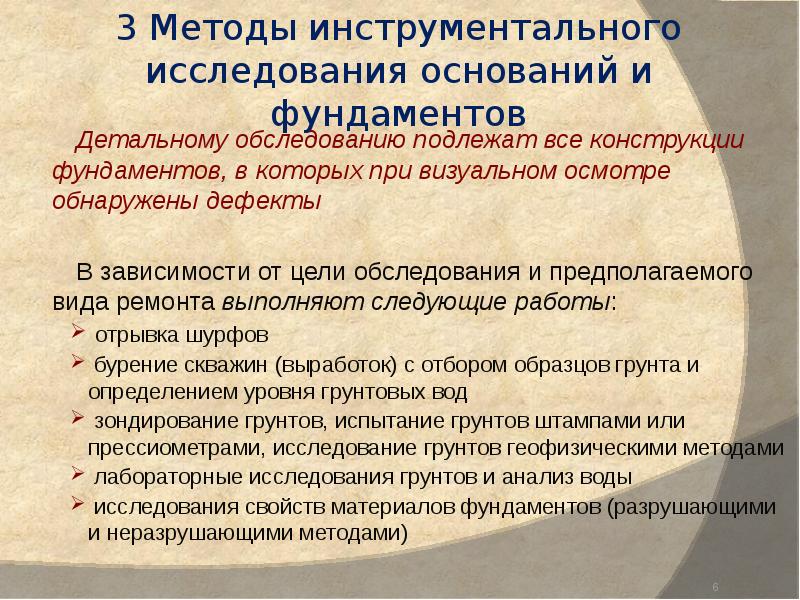 Обследование предполагает проведение полевых и лабораторных испытаний, исследование грунта, оценку несущей способности, определение механических и технических характеристик материалов. Проведение данного комплекса мероприятий позволяет в полной мере оценить состояние фундамента, выявив повреждения, их причины и слабые стороны конструкции в целом.